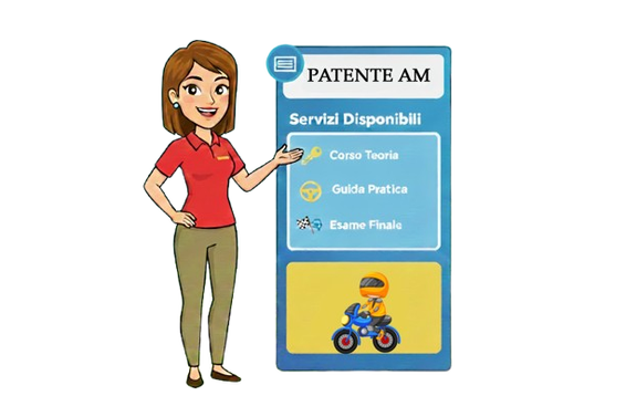La patente di categoria AM consente di condurre tutti i ciclomotori (a 2, a 3 e a 4 ruote – quadriciclo leggero), che sono veicoli che hanno una cilindrata uguale o inferiore a 50 cm³, la cui velocità massima è 45 kmh. Per il conseguimento della patente AM occorre sostenere un esame teorico a quiz e successivamente un esame pratico di guida, su pista e su strada.